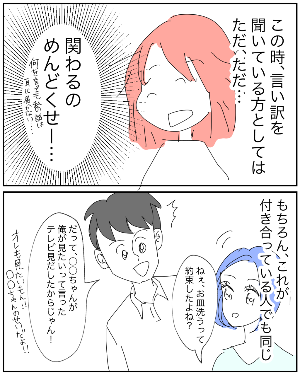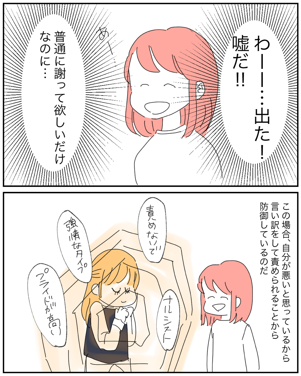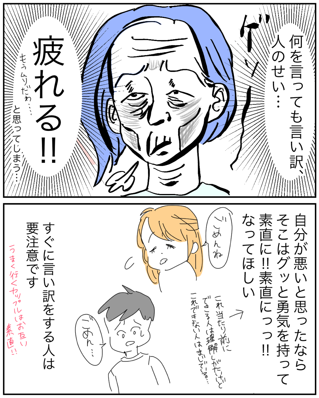 自分が悪いなら、素直なのが1番! 2021年11月01日 素直が1番!変なプライドとかまじでいらないよね🙈他の人気記事はこちらから↓↓↓ こちら是非登録してね↓↓↓ 「恋愛」カテゴリの最新記事 タグ :#恋活#婚活マンガ#恋愛漫画#恋愛#漫画#イラストエッセイ#イラスト#エッセイマンガ#コミックエッセイ#ナンパ < 前の記事次の記事 > コメント コメント一覧 (6) 1. Komo 2021年11月01日 18:42 本当に貧血になってる場合はどうすればいいんですか? 言い方で嘘だ!!ってわかるということでしょうか... 0 makarina がしました 3. ☆まかりな☆ 2021年11月02日 11:40 >>1 確かに説明不足でしたね。 このような人って、毎度毎度嘘や言い訳してるから長年見ているとわかるということです。ほんとに気分悪いならここまで来れないとか、言い訳する前は元気に登場してきたとか、色々とおかしい部分があるからですね。さすがに本当に気分悪い人にはこんな言い方はしないですよね。 説明不足でした😭 0 makarina がしました 2. こつん 2021年11月01日 23:19 いるいる!! こーゆー奴いる!!! うちの旦那がまさにこれです。 まず謝らない。 間髪いれずに言い訳か、全然別の話しをぶち込んでこっちの話しをぶった斬る。 どーゆー育てられ方したの?って思うし、子供がそれを見て、同じ様になったらと思うとゾッとする。 何ですぐ言い訳するの?別の話しで誤魔化そうとするの?って聞いてもそれを誤魔化そうとする。 厄介です。 0 makarina がしました 4. ☆まかりな☆ 2021年11月02日 11:42 >>2 ほんとに素直に認めてほしいだけなんですよね😭 認めたら次の話合いとか解決案とか出したりできるのに、それすら出来ない苛立ちはありますよね😭 ミスを認めるのは怖いかもしれないけど、受け止める勇気をまじで持って欲しい😂 0 makarina がしました 5. 許さん 2021年11月02日 12:31 僕はいつ遅れてもいいようにタイヤ痕のついたシャツとひしゃげたメガネを持ち歩いています 0 makarina がしました 6. ☆まかりな☆ 2021年11月02日 14:55 >>5 そんな準備してくるなんて、最高🎊👏笑 0 makarina がしました コメントフォーム 名前 コメント 記事の評価 リセット リセット 顔 星 情報を記憶 コメントを投稿する