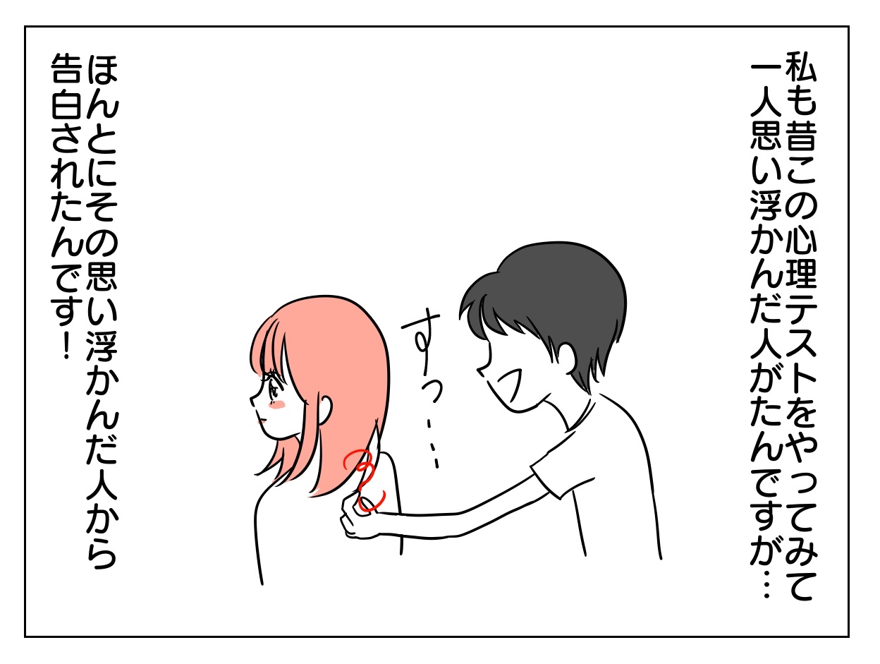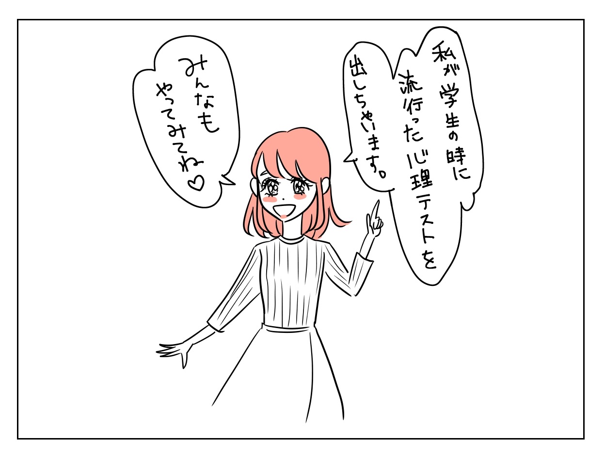 恋愛心理テスト 2021年11月14日 答えは浮かんだかな??答えはこちら↓↓↓思い浮かんだ相手は、あなたが自分に惚れていると思っている人✨だそうです🥰🥰🥰 「恋愛」カテゴリの最新記事 タグ :#まかりな#恋愛#恋愛漫画#漫画#コミックエッセイ#エッセイマンガ#イラスト#イラストレーター#婚活マンガ#婚活漫画 < 前の記事次の記事 > コメント コメント一覧 (6) 1. あみり 2021年11月22日 15:43 自分に何な人ー? なげうつな人? ほうる? 大事なところがわかんなーい!! 0 makarina がしました 2. うちなんちゅ 2021年11月22日 16:06 >>1 惚(ほ)れてる人、と書いてありますよー! 0 makarina がしました 3. 💰かおる 2021年11月22日 20:29 私が思い浮かべた人、前まで私が好きだったけどなんか悪いとこ見えちゃって今はなんとも思ってない人なんだけどまだ気になってるのかな 0 makarina がしました 5. ☆まかりな☆ 2021年11月23日 12:59 >>3 そうかもー?!😝 0 makarina がしました 4. ⚫︎ 2021年11月23日 09:01 上司…休日なのに出てくるなや 0 makarina がしました 6. ☆まかりな☆ 2021年11月23日 13:00 >>4 ウケる笑 せっかくの休日が。。。😈 0 makarina がしました コメントフォーム 名前 コメント 記事の評価 リセット リセット 顔 星 情報を記憶 コメントを投稿する