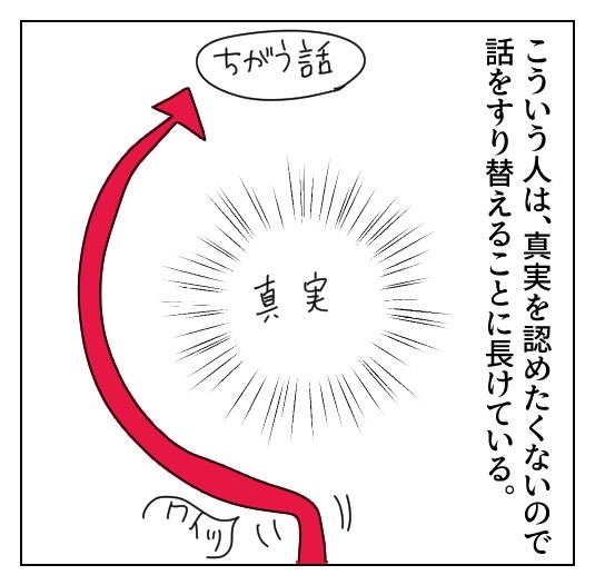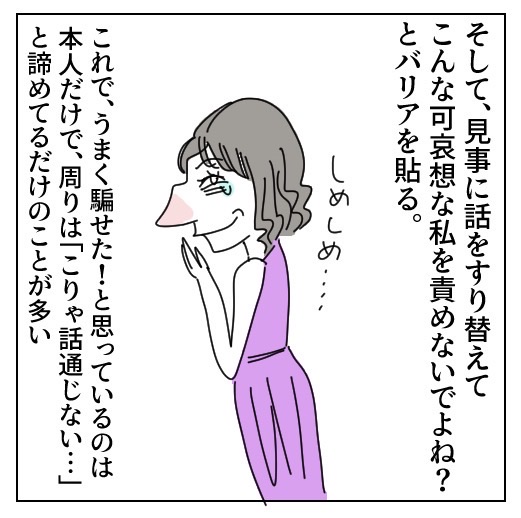そうなんですよ!話を、そっち!?っていう方向にすり替えて最終的には『私なんて○✕△~!!!』って被害者方面に持っていくんですよ……。