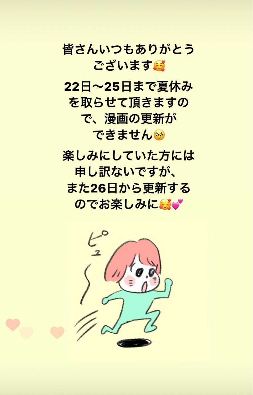 夏休みのお知らせ 2022年08月24日 お知らせが遅くなってしまってすみません😖😖😖💦 カテゴリなしの他の記事 < 前の記事次の記事 > コメント コメント一覧 (3) 1. ゆっくり休んでくださいね🥰 2022年08月24日 06:17 いつも楽しい漫画ありがとうございます ゆっくり休んで下さーい🍀 続き楽しみにしてます😆 0 makarina がしました 2. ヒロミ 2022年08月24日 08:36 素敵な夏休みをお過ごしください😊休みが明けたら又バリバリ頑張って下さい。😄 0 makarina がしました 3. はみ子 2022年08月24日 19:43 お疲れ様です。 夏休み明け楽しみに待ってまーす!! 0 makarina がしました コメントフォーム 名前 コメント 記事の評価 リセット リセット 顔 星 情報を記憶 コメントを投稿する