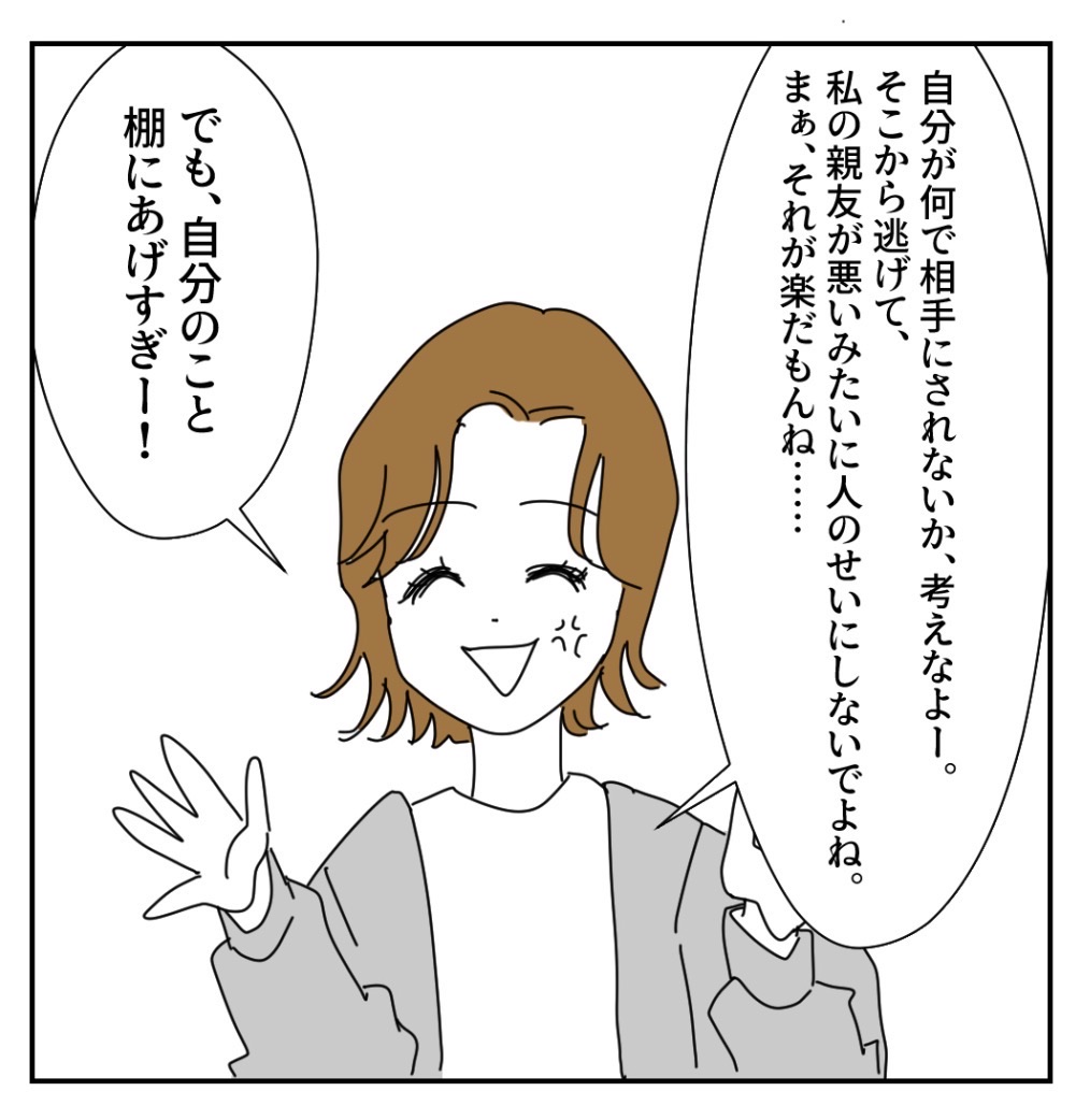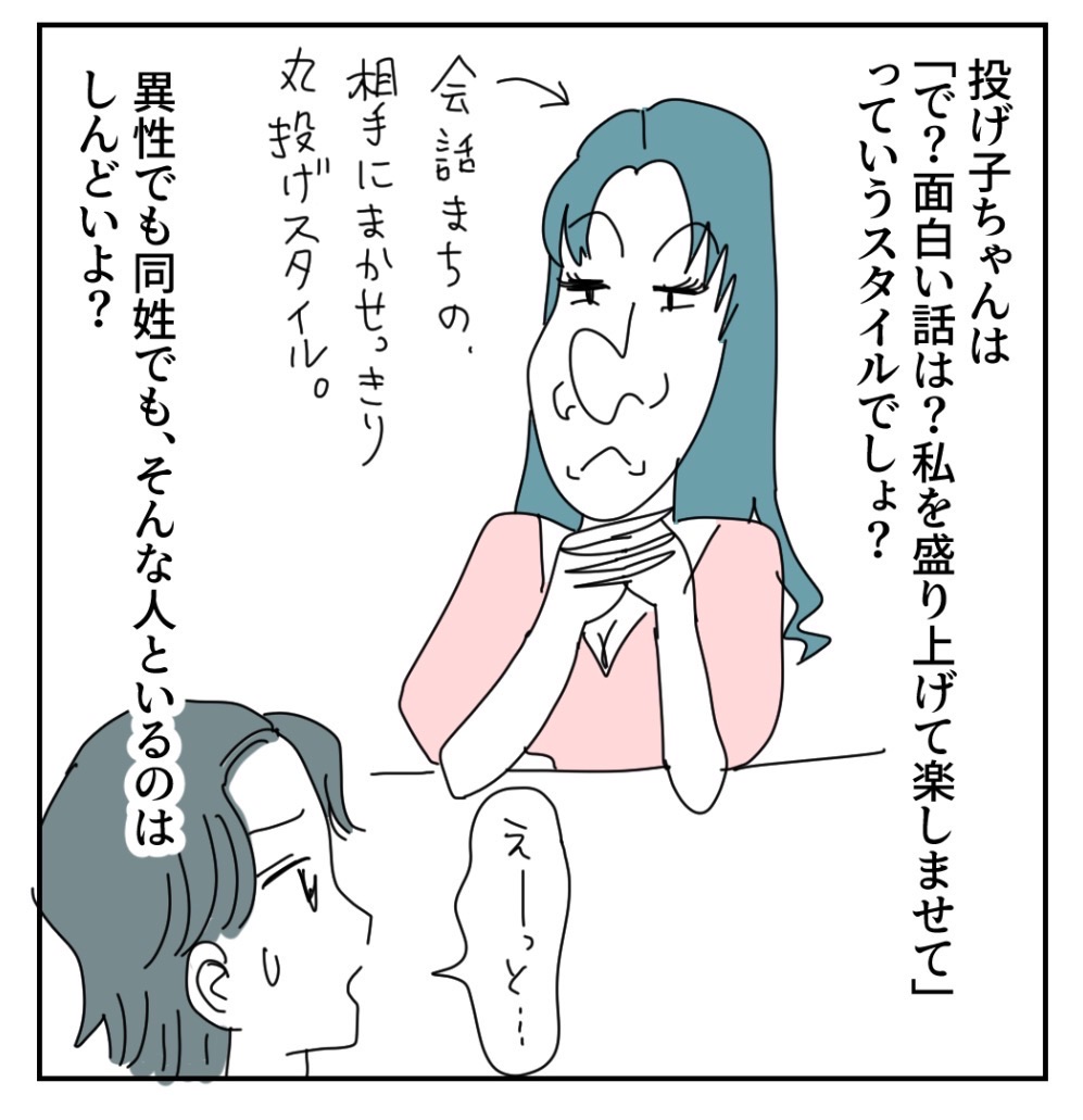 マルっと丸投げ「丸 投げ子」参上!!【16】 2023年02月20日 🔵1つ前の話はこちらから🔵↓↓↓ つづきは下に↓↓↓※この話は実話を元にしたフィクションです。🌈続きはコチラから🌈🔵初めから読む場合はこちらから🔵↓↓↓🟣元祖すご子ちゃんお話はこちらから🟣↓↓↓🟢他のすご子ちゃんはこちらから🟢↓↓↓⭕️こちらの登録もぜひー!⭕️最近、更新時間がバラバラなこともあるか登録してると、お知らせがLINEに届いて便利✨※この話は実話を元にしたフィクションです。 「丸っと丸投げ」カテゴリの最新記事 タグ :#丸投げ子#勘違すご子#丸投げ女#コミックエッセイ#ギャグ漫画#イラストエッセイ#イラストレーター#まかりな#漫画が読める#漫画 < 前の記事次の記事 > コメント コメント一覧 (7) 1. 逆にありがたい! 2023年02月20日 19:09 いやー、普通ここまで言ってもらえませんよ…。 全てがめちゃくちゃ的確ですごい。 聞く耳、ありますように! 0 makarina がしました 2. ふふふ 2023年02月20日 19:25 今時、こんなにズバッと言ってくれる人いないよね〜 うんうん、もう会わないから言えるのもわかる 自分の友だち悪く言われてたら、ムカつくしね ズバッとちゃん サイコー👏🏻👏🏻👏🏻 って 主人公の女の子も思ってると思う けど、ズバッとちゃんと別れて 投げ子ちゃんと二人になったときが怖い⁉️ 0 makarina がしました 3. basil 2023年02月20日 19:48 まさに、ぐうの音も出ない投げ子 今まで人のアドバイスを聞いてこなかったからこうなったんだろうけど、意外と赤の他人の言葉が刺さったりして… 0 makarina がしました 4. スッキリ 2023年02月20日 20:57 ズバッと姉さんさすがっす👏 0 makarina がしました 5. この子 2023年02月20日 21:40 すごいですね。的確に露骨に批判するのではなく理路整然と伝えることを伝えていて。 いい子の友達はいい子なんだなと思いました。 0 makarina がしました 6. さいたま 2023年02月20日 21:45 もう会わないからこそ、友達じゃないからこそ言いたくないけど、友達じゃなくてもう会わない子のためにここまで言ってあげるの優しい。けどこいつは絶対反省しない。モテないことも人に責任丸投げにするんだから 0 makarina がしました 7. おー 2023年02月22日 08:22 ここまで言われたら自分の落ち度に気付くかな?一コマ目文の繋がりがおかしいけど。 ここで合コンでも丸投げて設定が出てきたか!なるほどー 0 makarina がしました コメントフォーム 名前 コメント 記事の評価 リセット リセット 顔 星 情報を記憶 コメントを投稿する