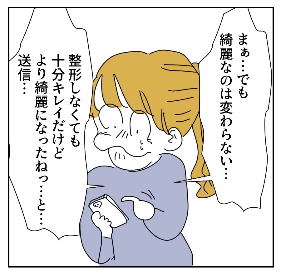 「私…綺麗?」な女さん【10】 2023年04月14日 🔵1つ前の話はこちらから🔵↓↓↓ つづきは下に↓↓↓※この話は実話を元にしたフィクションです。🌈続きはこちらから🌈 🟣初めから読む場合はこちらから🟣こちらの登録もお願いします🙇♂️💝 「私綺麗?な女さん」カテゴリの最新記事 タグ :#まかりな#漫画が読める#イラストエッセイ#イラストレーター#コミックエッセイ#絵日記#マンガブログ#キャバ嬢#整形#メンヘラ < 前の記事次の記事 > コメント コメント一覧 (4) 1. んー。 2023年04月14日 19:26 絵の加減だとは充分思いますが、 見れば見るほど、なんか変…。 前の顔の方が可愛い(絵の加減でしょうが)。 0 makarina がしました 2. たぶん 2023年04月14日 19:46 整形して、さらにカメラ加工して……って感じじゃないかな… そんなアゴ尖ってたら 刺さるよ😅 0 makarina がしました 3. 長い顎… 2023年04月14日 20:11 某学園のハンサムな方々か後ろから抱きつく系帝を彷彿とさせる… 0 makarina がしました 4. みる 2023年04月14日 20:51 改造しなきゃ良かったのに 0 makarina がしました コメントフォーム 名前 コメント 記事の評価 リセット リセット 顔 星 情報を記憶 コメントを投稿する