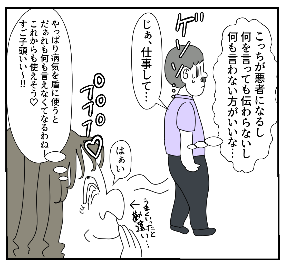 会社でも、自分が主役にならないと気が済まない女子【27】 2023年07月21日 🔵1つ前の話はコチラ🔵 こうやって、人はどんどんすご子に関わりを持たなくなって行く…つづきは下に↓↓↓※この話は実話を元にしたフィクションです。🌈続きはコチラ🌈 🟢初めから読むなら🟢🟣勘違すご子シリーズ🟣↓↓↓⭕️こちらの登録もぜひー!⭕️最近、更新時間がバラバラなこともあるか登録してると、お知らせがLINEに届いて便利✨ 「会社でも、自分が主役にならないと気が済まない女子に出会った話」カテゴリの最新記事 タグ :#エッセイ漫画#マンガブログ#イラストレーター#イラストエッセイ#漫画が読める#コミックエッセイ#勘違い女#勘違すご子#キャラ強#エッセイギャグ漫画 < 前の記事次の記事 > コメント コメント一覧 (4) 1. しゃ、社長オォォ〜😂 2023年07月21日 19:48 すご子ちゃんを図に乗らせないでくださいよぉぉ 0 makarina がしました 2. ミミ 2023年07月21日 21:37 前の職場もこんな感じで迷惑してやっと辞めた(辞めさせた?)と思ってたら、すご子再来でもう関わり合いたくないです…ってなったりしない?😂 0 makarina がしました 3. え? 2023年07月22日 10:23 クビにされた前の会社にどのツラ下げて連絡するんだろうか 0 makarina がしました 4. えー 2023年07月31日 20:46 持病案件で目が覚めたと思ってたのに、この社長相当間抜けだなぁ…経営者に向いてないよー すご子雇ってる時点で損でしかないのに 0 makarina がしました コメントフォーム 名前 コメント 記事の評価 リセット リセット 顔 星 情報を記憶 コメントを投稿する