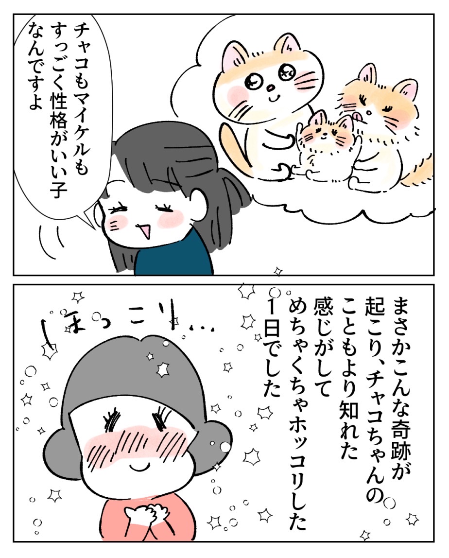 ほっこりする奇跡!! 2023年10月04日 🔵1つ前の話はコチラ🔵 ちなみに、シャンプーはめちくちゃふわふわスベスベになって、可愛さが100倍パワーアップされました!フワッフワ!🫧最高です!次の話は下に↓↓↓🌈次の話はコチラ🌈 🐱初めから読む🐱↓猫漫画の 一覧はこちらから↓こちらの登録もお願いします🥹猫漫画の更新は、月~金曜日12時~13時更新を目指してますが、時間が前後してしまうので💦登録すると更新のお知らせが届いて便利✨ 「猫のチャコちゃん」カテゴリの最新記事 タグ :#イラストエッセイ#マンガブログ#イラストレーター#漫画が読める#エッセイマンガ#猫漫画#猫日記#猫イラスト#猫漫画エッセイ#猫マンガ < 前の記事次の記事 > コメント コメント一覧 (3) 1. うちなんちゅ 2023年10月04日 14:01 すごいですね!! まさかのママ猫と同じ名前!🥰 0 makarina がしました 2. かよこ 2023年10月04日 15:17 チャコ=ジュニアちゃんですね チャコ=カワイイ=ジュニア ふわふわで更に可愛さパワーアップ! 本当に可愛いです 0 makarina がしました 3. ふう 2023年10月05日 08:01 奇跡や! 0 makarina がしました コメントフォーム 名前 コメント 記事の評価 リセット リセット 顔 星 情報を記憶 コメントを投稿する